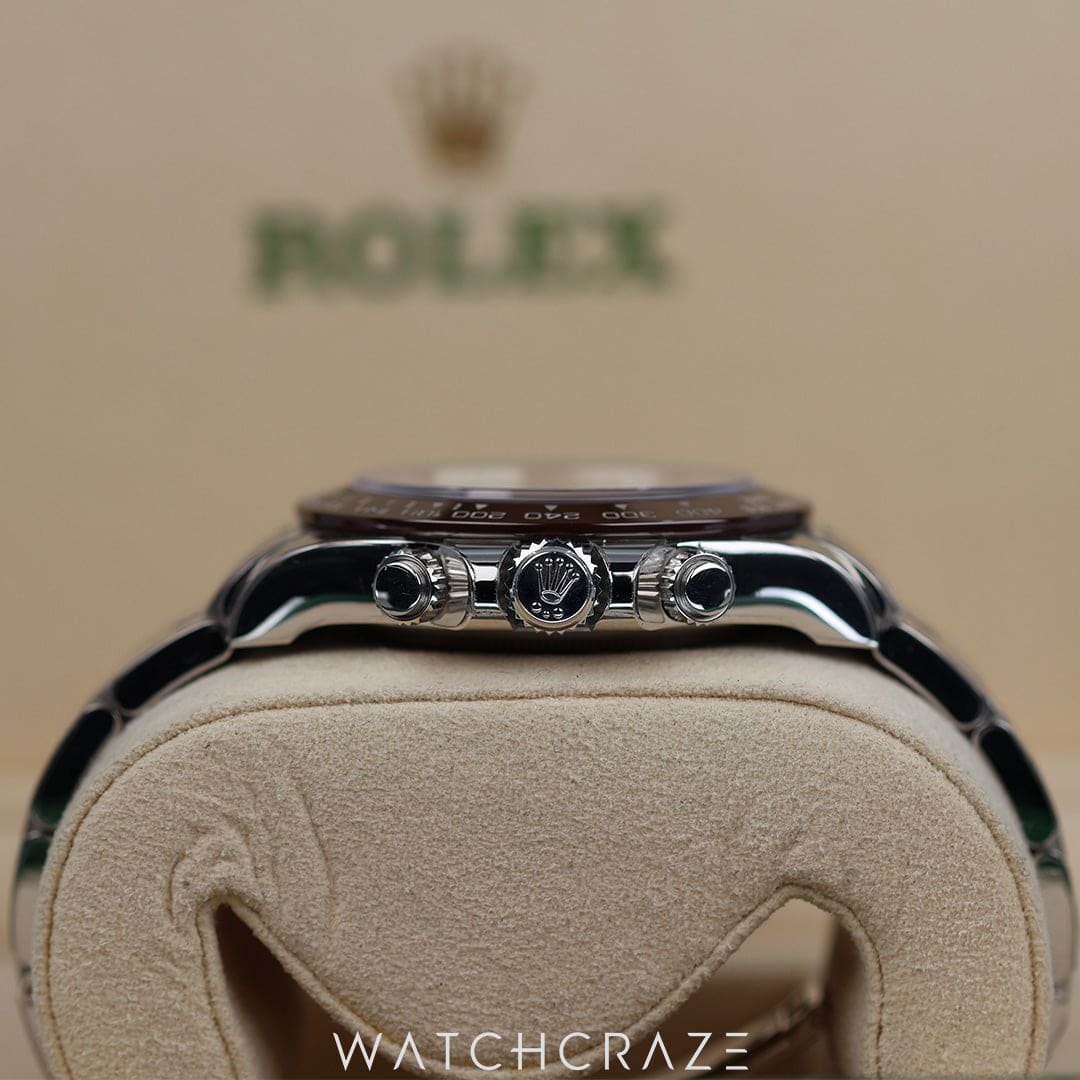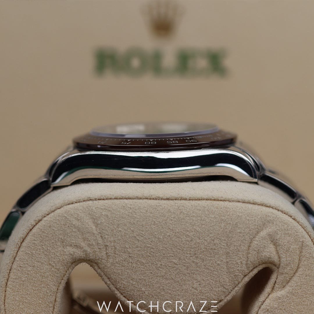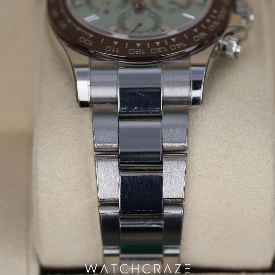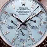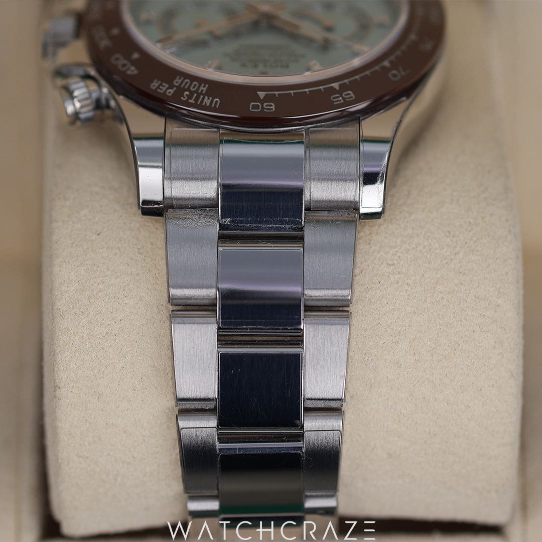 Introducing the 2021 Rolex Daytona Platinum Ice Blue Dial with Diamond Baguette Markers 40MM, model 116506, an epitome of luxury and precision. This stunning timepiece boasts a 40mm platinum case, radiating sophistication and exclusivity. The ice blue dial, a hallmark of Rolex’s platinum watches, is elegantly adorned with diamond baguette hour markers, adding a touch of brilliance. The watch features a chestnut brown ceramic bezel with a tachymetric scale, perfect for measuring speed. Powered by the Rolex Calibre 4130 automatic movement, it ensures impeccable accuracy and performance. The platinum Oyster bracelet completes this masterpiece, offering both comfort and a luxurious feel. Experience the ultimate in horological excellence with the Rolex Daytona Platinum.