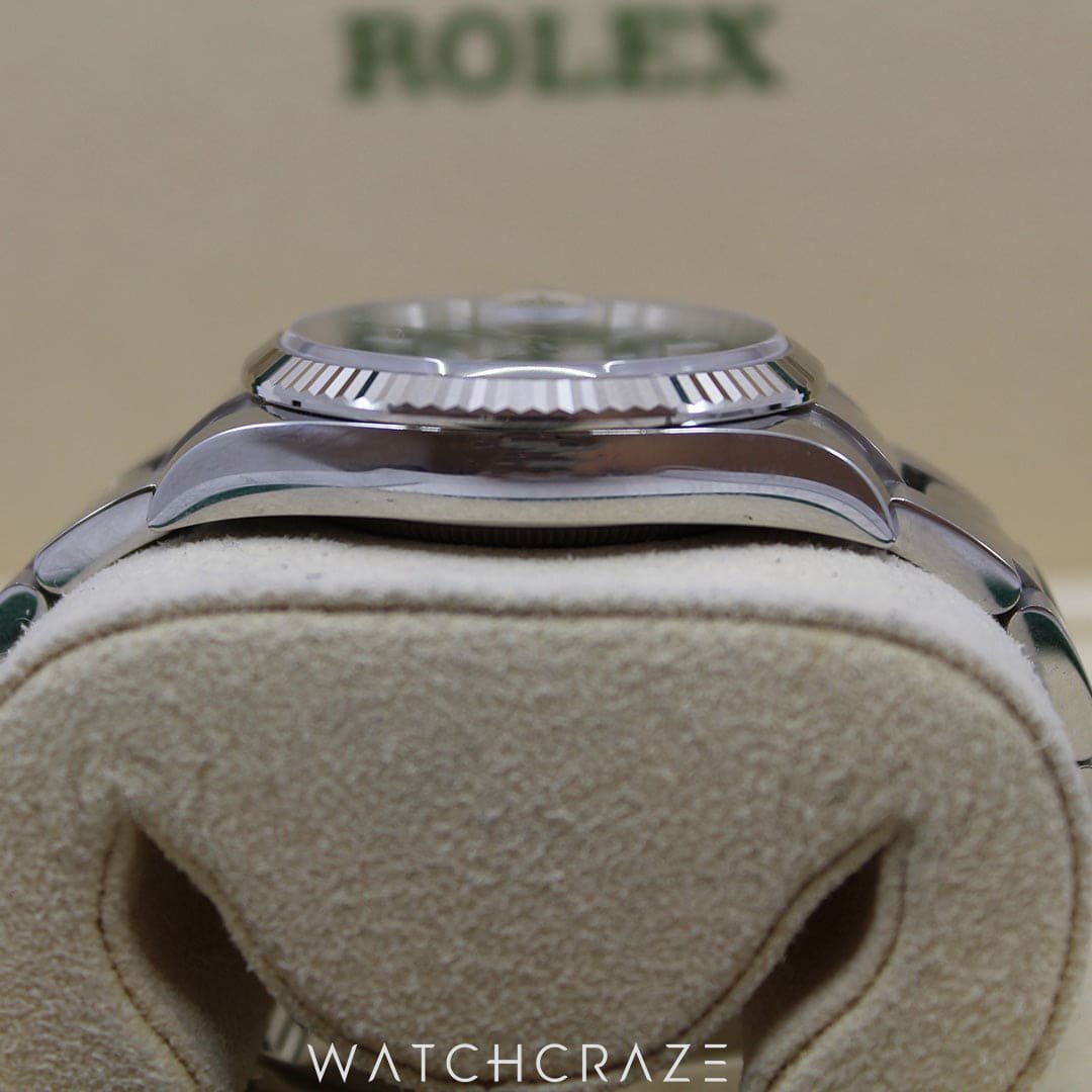 The watch’s 36mm stainless steel design mixes elegance and comfort. Its stunning mint green dial draws attention and modernises the Datejust style.