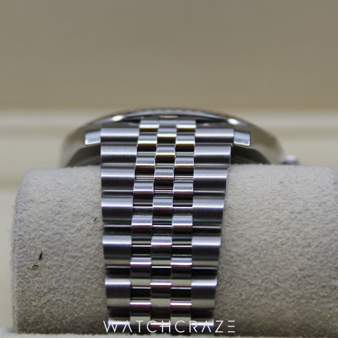 The 41mm stainless steel case perfectly balances traditional proportions and modern design. It is a versatile option for any occasion thanks to its immaculate white dial, which emanates a sense of purity and refinement. Excellent reading is ensured by luminescent hour markers and hands, and the classic date window with the Cyclops lens magnifier at 3 o’clock provides both practicality and charm.