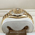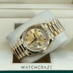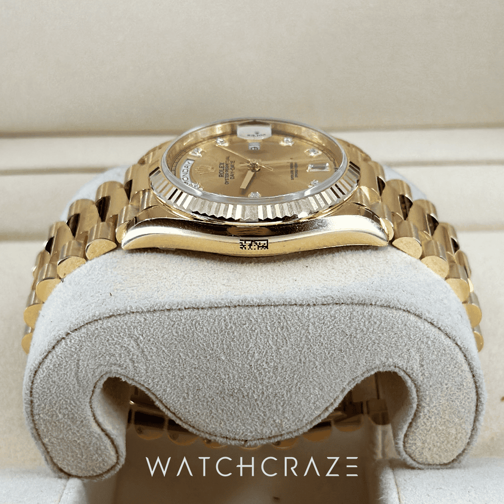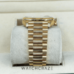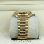 Its diamond hour markers make this timepiece stand out. The watch’s beauty is enhanced by these carefully set diamonds. The Day-Date collection’s champagne dial radiates luxury. The watch’s iconic day and date windows at 12 and 3 o’clock add functionality and depth to its sunray finish.