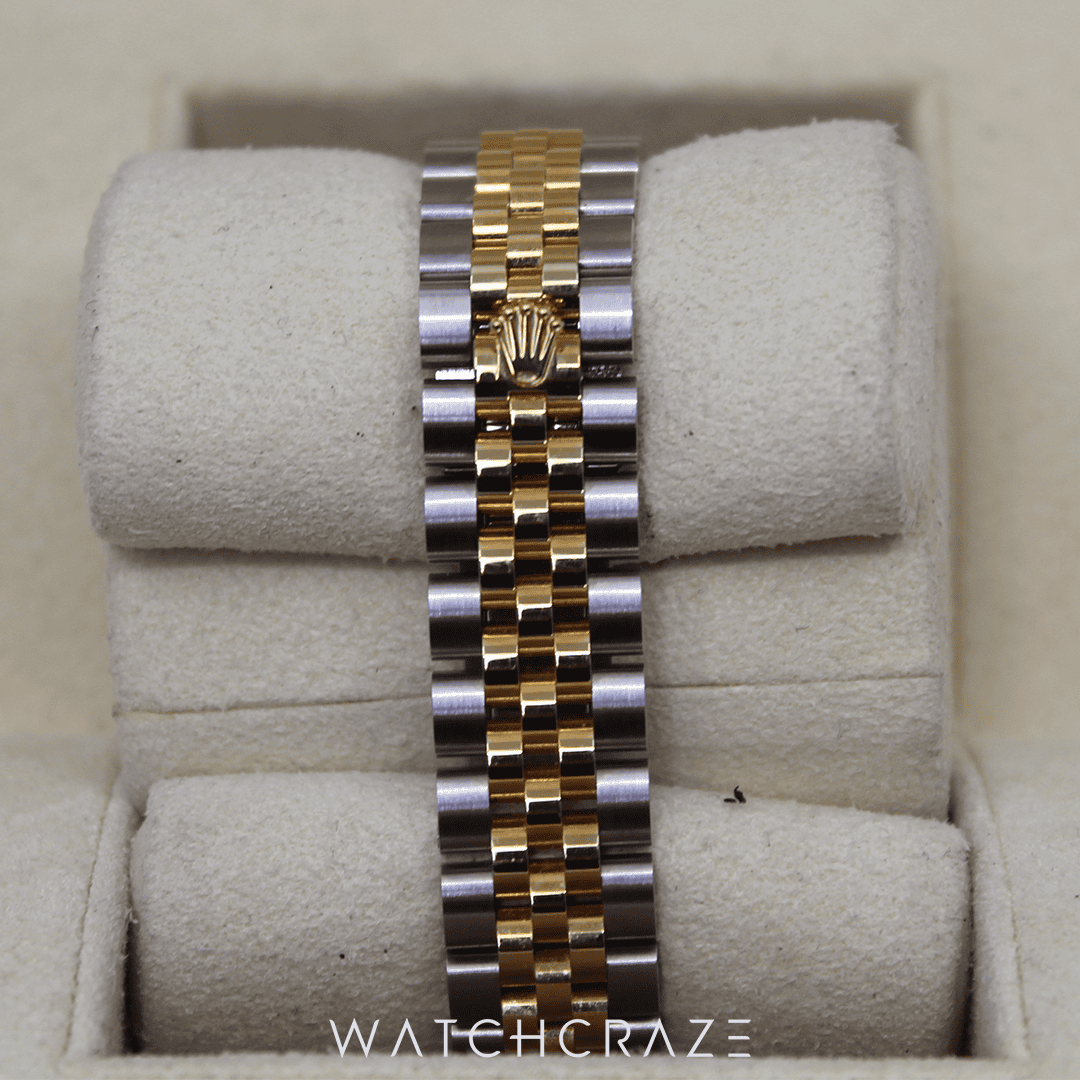 The 28mm Oyster case, a tasteful combination of Oystersteel and 18ct yellow gold, represents Rolex’s dedication to sturdiness and elegance. The timepiece gains a hint of distinguished complexity from the fluted bezel, a Rolex icon.