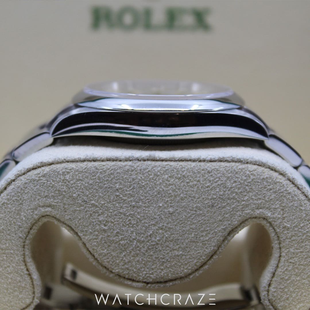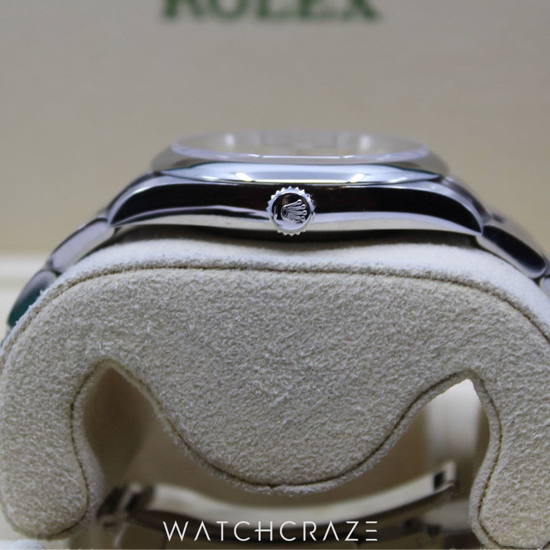 Unique Dial: The watch has a simple, minimalist dial with bright hour markings and Rolex’s trademark Mercedes hands. The recognisable Rolex crown at 12 o’clock is a symbol of legacy and authenticity.