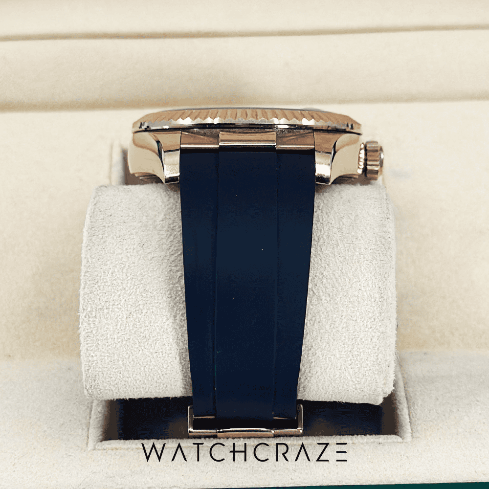 Rolex’s 18k Everose gold Sky-Dweller 326235 is strong and beautiful. Rolex’s iconic 42mm Oyster case with a fluted rotatable bezel and bracelet provide a secure and comfortable fit.